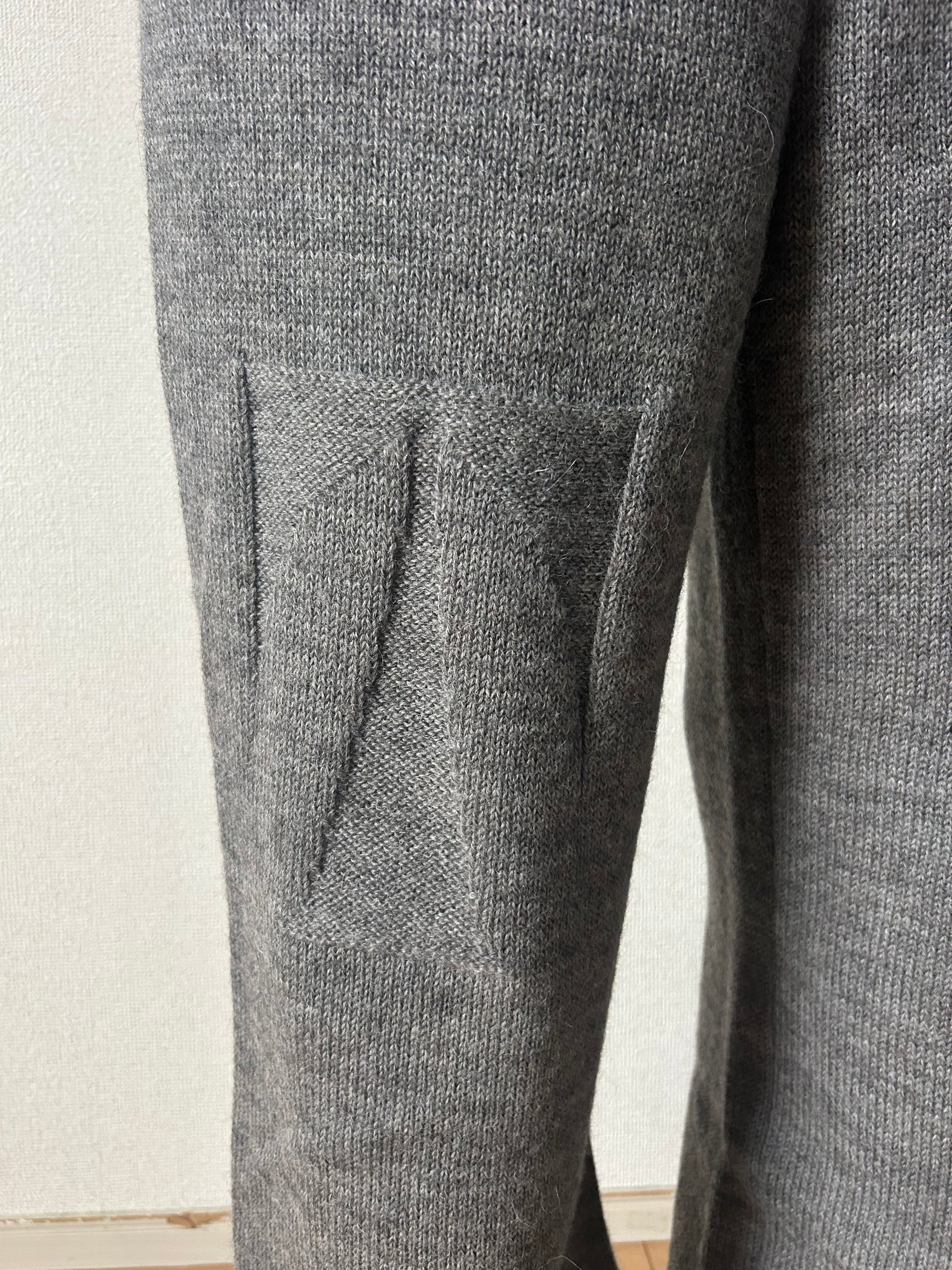 These knit pants are made from a blend of fine Peruvian alpaca and South American wool. Using a links knitting technique—often seen in award sweaters and lettered sweaters—we created a subtle, tonal pattern. We provided our signature slacks pattern to the knit factory, which served as the base for production. The waistband features woven elastic with a matching drawstring for additional adjustment. The hem is also finished with woven elastic, allowing the fabric to gather softly at the ankles. The material has a comfortable weight, and the washing process was adjusted so it can be worn directly against the skin without causing itchiness. Our goal was to create knit pants that men would genuinely want to wear.