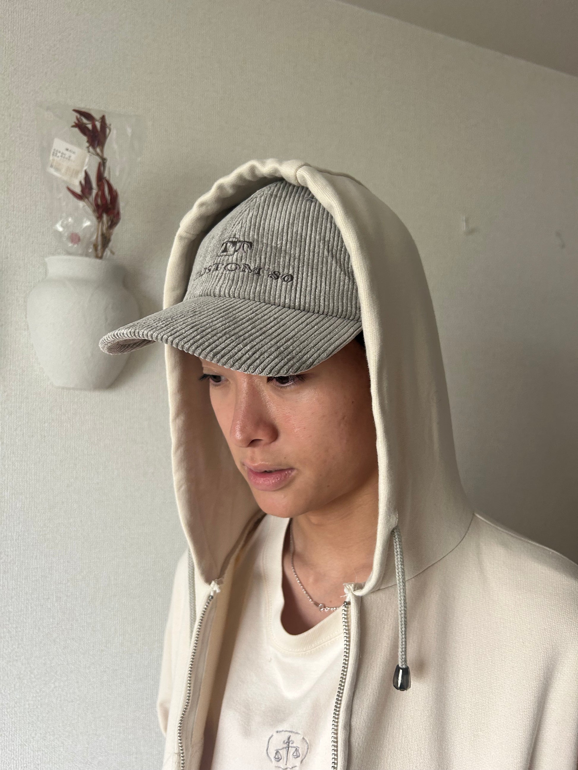 ナイロンの毛羽が多いスパン糸とポリエステルで作られたインテリアファブリックの表情が強い化繊のコーデュロイ生地を使っています。街中でおじいちゃんが被っている、どこのブランドかわからないけどかっこいいキャップをイメージしました。CUSTOM'80とはブランドを始める土台となった紳士服製造業の屋号名です。TOZAOUの"T"のロゴを起点に高級自動車メーカーや運送屋を想起させるデザインです。