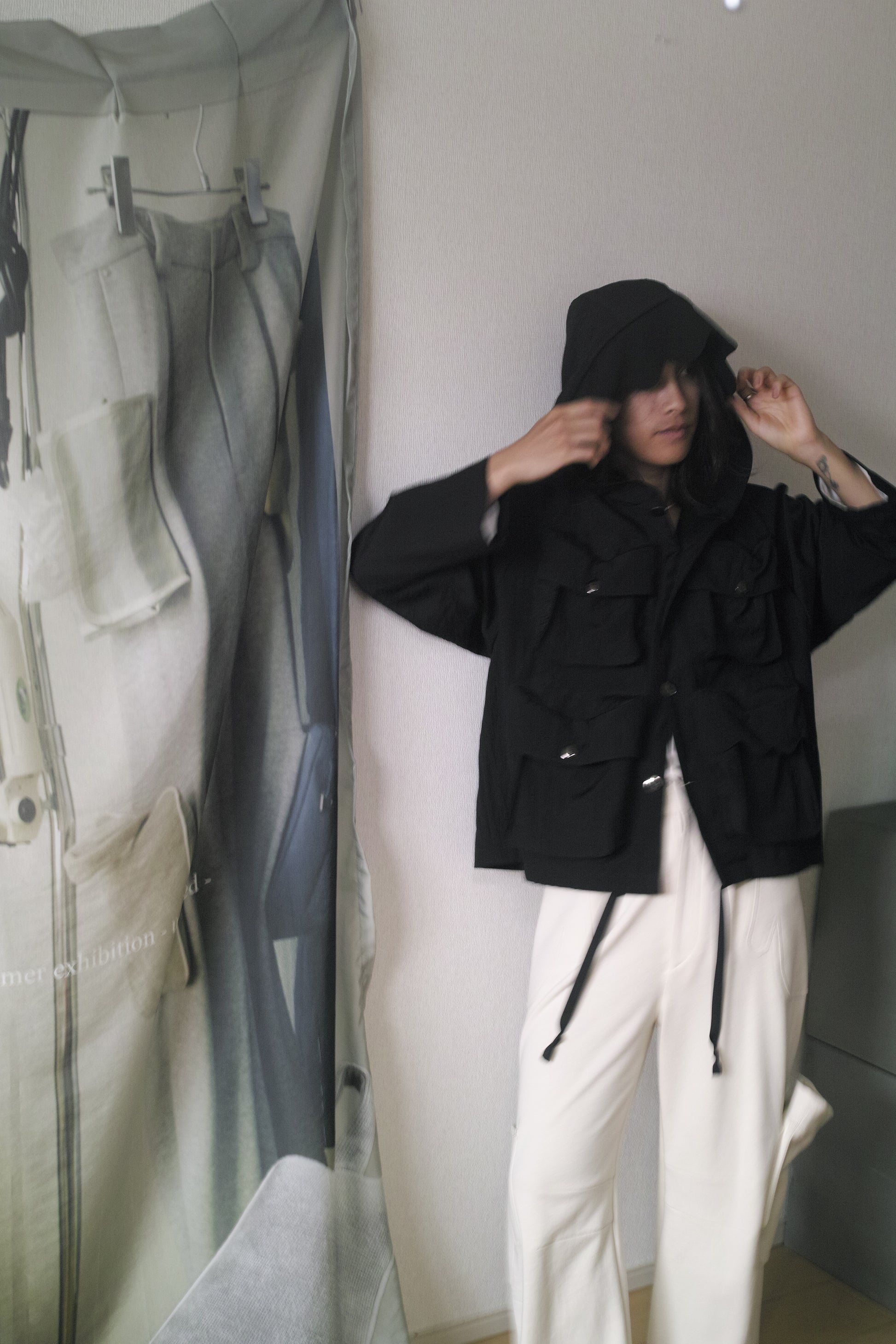 ミトンをカーゴポケットに見立てたスウェットパンツです。よく行くプレス工場で大量に干されていたミトンから思いつきました。左ひざのミトンは外して手袋のように使用できます。