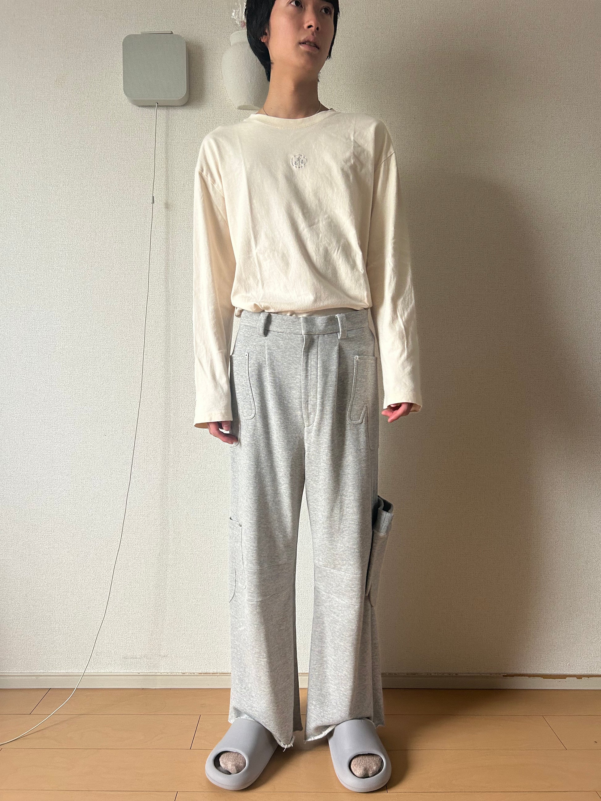 These sweatpants are designed with mittens reimagined as cargo pockets. They feature deep outward pleats and two darts around the inner knee area, while the waist construction is closer to that of tailored slacks rather than typical easy pants. This gives them a structured silhouette and a refined appearance not usually found in sweatpants. The mitten on the left knee can be detached and used like an actual glove. The hem is left raw with stitching to prevent fraying. The idea came to me when I saw a large number of mittens hanging to dry at a press factory I often visit.