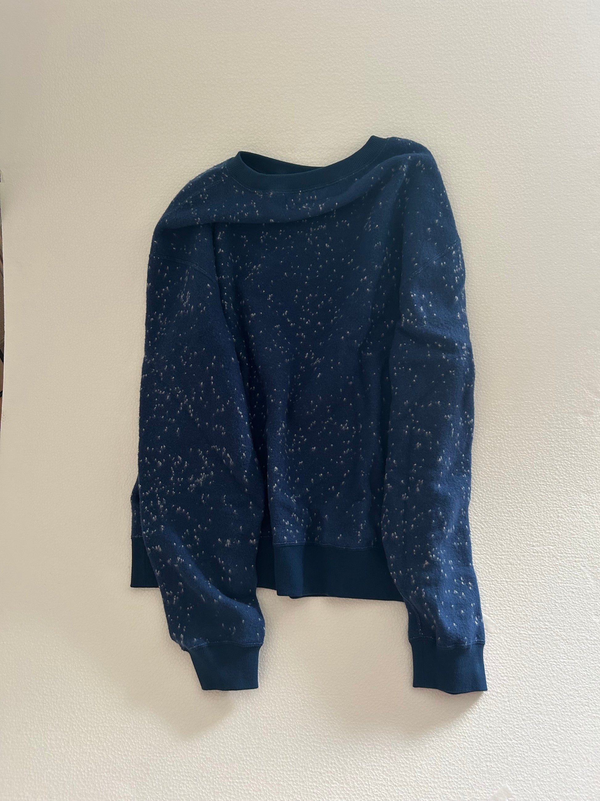 生地の表にウールの糸、裏にポリエステルの糸を使用、ウールの染色をした後に生地表を深く起毛することで裏のポリエステルの糸を点状に引っ張り出してできたウールスウェット生地です。両手ミトンに見立てたウォームポケットが付いています。