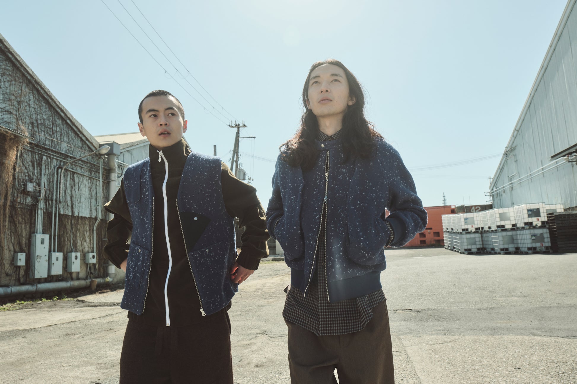 生地の表にウールの糸、裏にポリエステルの糸を使用、ウールの染色をした後に生地表を深く起毛することで裏のポリエステルの糸を点状に引っ張り出してできたウールスウェット生地です。回るルーレットの残像をイメージしたポケット配置が特徴です。