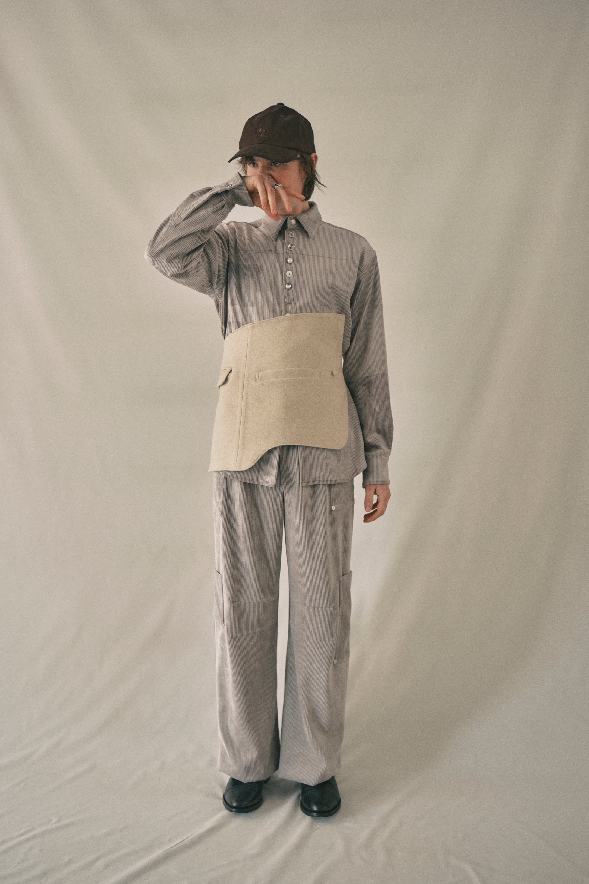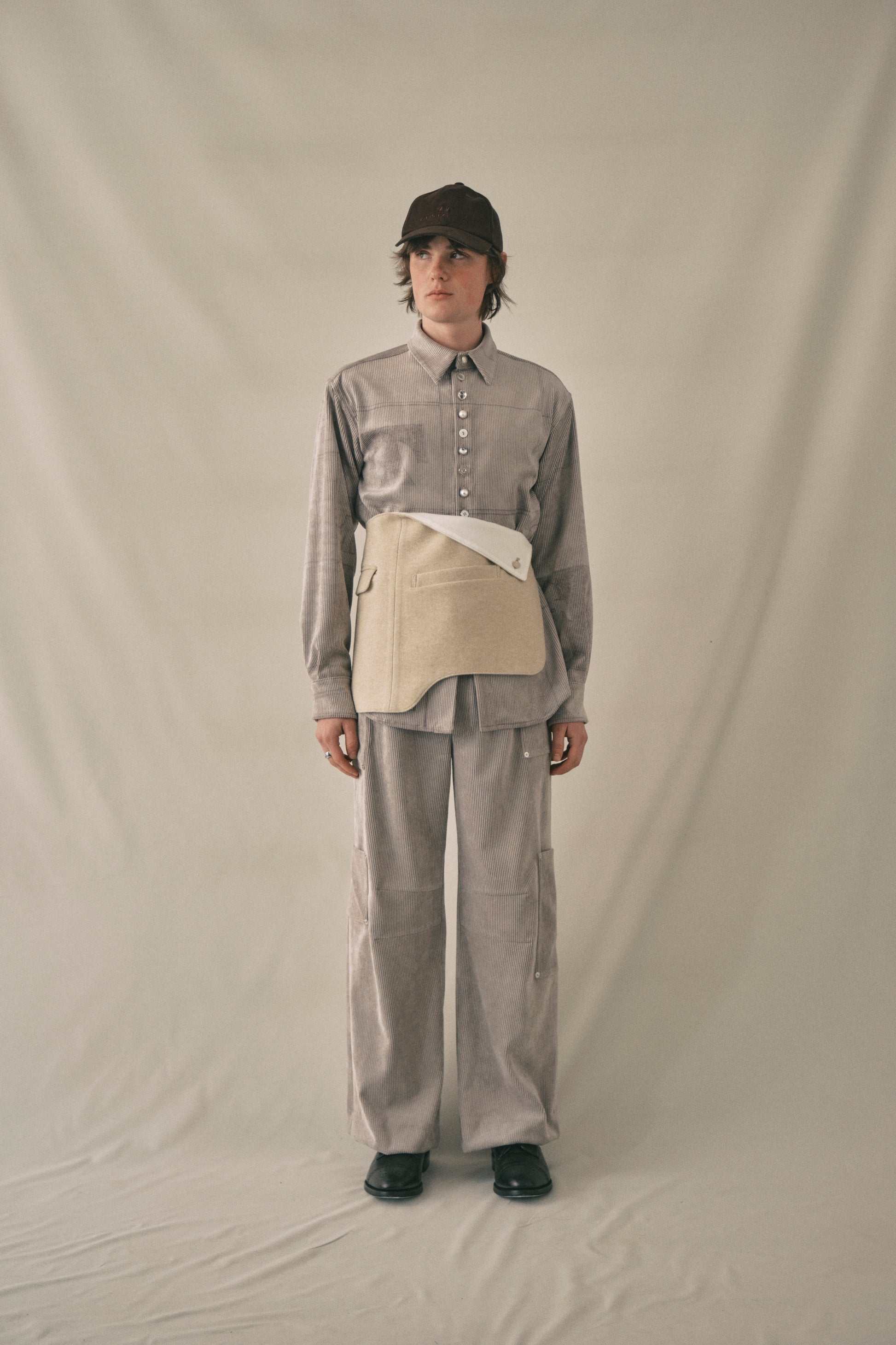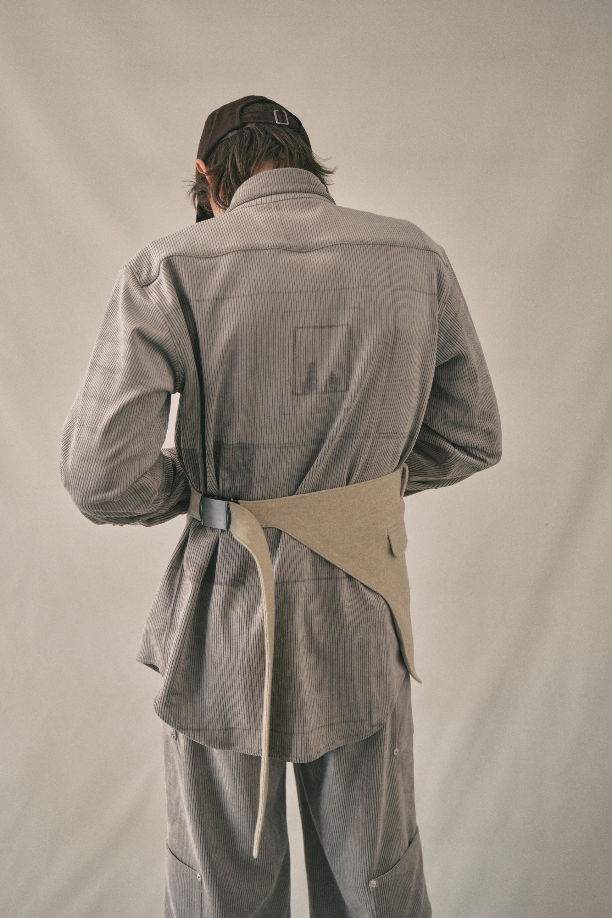 ニードルパンチ加工を施したダブルニットをベースにチェックの裏地をつけた、スラックスの半身とベルトが一体化したようなエプロンバッグです。ポケットはペットボトル(500ml)が入るぐらいの広さがあります。バックルで長さ調整ができます。“Lama”はパロンバ夫妻がデザインした"LAMA921”という長椅子のフォルムに影響を受けたデザインです。